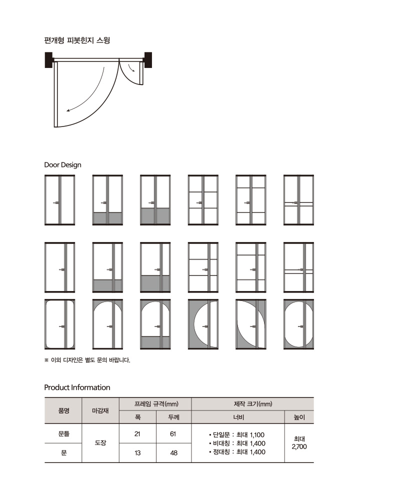 • ÇϺΠÃàÀ» Áß½ÉÀ¸·Î ȸÀüÇÏ´Â 180¢ª ÇǺ¿¹æ½ÄÀ¸·Î µÇ¾î ÀÖÀ¸¸ç, À¯¾Ð¹æ½ÄÀÇ ¼¼¹Ì¿ÀÅä ±â´ÉÀÌ Àû¿ëµÇ¾î »ç¿ëÇÏ±â Æí¸®ÇÕ´Ï´Ù. ¿À¿¥µµ¾îÀÇ ½ºÀ® µµ¾î´Â Á¤´ëĪ ¿©´ÝÀÌ µµ¾î·Î W1,401 ÀÌ»óºÎÅÍ ¼³Ä¡°¡ °¡´ÉÇϸç, Çö°ü µµ¾î »Ó ¾Æ´Ï¶ó ¸ÅÀå, »ç¹«½Ç µî ´Ù¾çÇÑ °ø°£¿¡ Àß ¾î¿ï¸³´Ï´Ù.