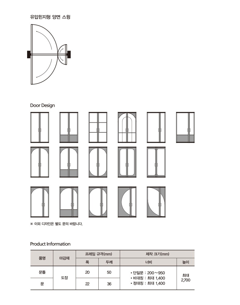 • ÇϺΠÃàÀ» Áß½ÉÀ¸·Î ȸÀüÇÏ´Â 180¢ª ÇǺ¿¹æ½ÄÀ¸·Î µÇ¾î ÀÖÀ¸¸ç, À¯¾Ð¹æ½ÄÀÇ ¼¼¹Ì¿ÀÅä ±â´ÉÀÌ Àû¿ëµÇ¾î »ç¿ëÇÏ±â Æí¸®ÇÕ´Ï´Ù. ¿À¿¥µµ¾îÀÇ ½ºÀ® µµ¾î´Â Á¤´ëĪ ¿©´ÝÀÌ µµ¾î·Î W1,401 ÀÌ»óºÎÅÍ ¼³Ä¡°¡ °¡´ÉÇϸç, Çö°ü µµ¾î »Ó ¾Æ´Ï¶ó ¸ÅÀå, »ç¹«½Ç µî ´Ù¾çÇÑ °ø°£¿¡ Àß ¾î¿ï¸³´Ï´Ù.