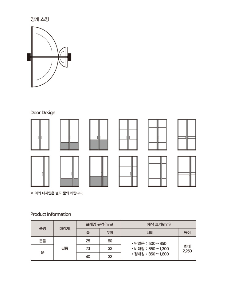 • ÇϺΠÃàÀ» Áß½ÉÀ¸·Î ȸÀüÇÏ´Â 180¢ª ÇǺ¿¹æ½ÄÀ¸·Î µÇ¾î ÀÖÀ¸¸ç, À¯¾Ð¹æ½ÄÀÇ ¼¼¹Ì¿ÀÅä ±â´ÉÀÌ Àû¿ëµÇ¾î »ç¿ëÇÏ±â Æí¸®ÇÕ´Ï´Ù. ¿À¿¥µµ¾îÀÇ ½ºÀ® µµ¾î´Â Á¤´ëĪ ¿©´ÝÀÌ µµ¾î·Î W1,401 ÀÌ»óºÎÅÍ ¼³Ä¡°¡ °¡´ÉÇϸç, Çö°ü µµ¾î »Ó ¾Æ´Ï¶ó ¸ÅÀå, »ç¹«½Ç µî ´Ù¾çÇÑ °ø°£¿¡ Àß ¾î¿ï¸³´Ï´Ù.